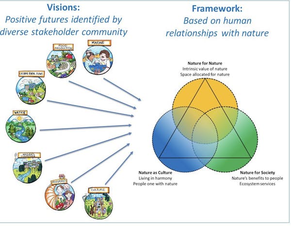 The framework aims to illustrate all the ways nature is appreciated. It’s intended to allow multiple voices to debate what a more desirable future for people and the planet could look like. A recent application of the framework with youth from around the world illustrated some common features of desirable futures. These included an emphasis on diverse community solutions, a reconnection with nature and a reconfiguration of the economic system to showcase what really is valuable for well-being.