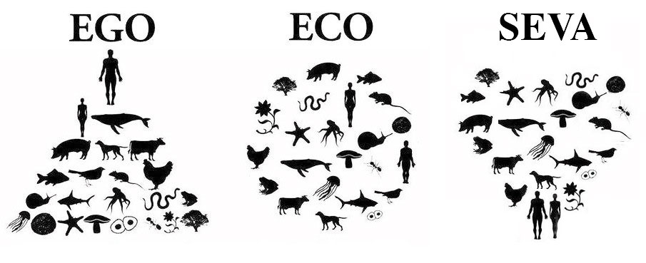 The earliest illustration of ‘Ego Eco Seva’ was in a GlanceSideways blog, Oct 2012 adjusting the Ego Eco graphic to show ‘the path to a perfect relationship within the ecosystem” As a graphic, it triggers a powerful and necessary reframing of Ego-Eco as the attitude needed to create a sustainable culture, ‘one that nourishes and cares for the earth we live on. Seva is a role that can only be performed with a relationship of love and humility to all entities in the environment’