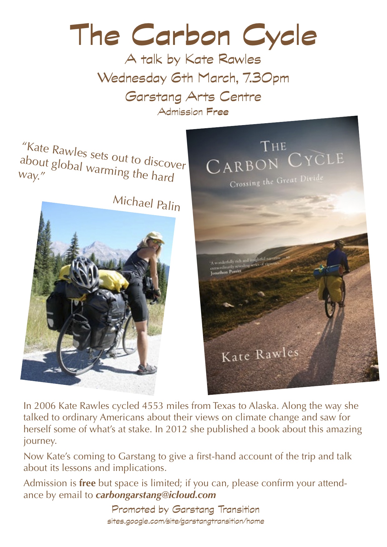Now Kate’s coming to Garstang to give a first-hand account of the trip and talk about its lessons and implications. Admission is free but space is limited; if you can, please confirm your attendance by email to carbongarstang@icloud.com