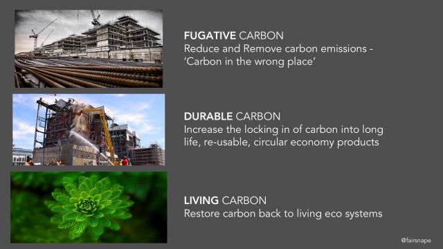 Before diving in to the role of trees within managing construction CO2 – we need to understand current carbon footprint thinking – so take a look at this fairsnape blog post – Carbon Is Not The Enemy – on why we need to balance the Fugitive Carbon with Durable and Living Carbons
