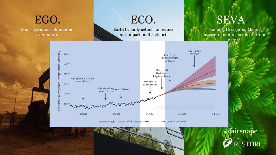 We need something more, a new mindset to eclipse ‘Eco’. Many like myself (Daniel Wahl, Cost Restore and others) are using the Sanskrit expression of Seva. It translates as ‘being in service’ which I have used as ‘doing the right thing’ because we are a part of, not apart from nature, it is very much reciprocity, we are in service to nature as nature is in services to us.